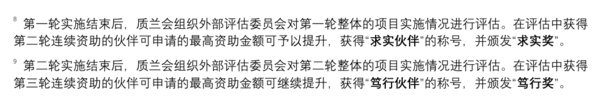 笃行计划项目最长可以资助三轮,每轮包括三个执行年,每一轮项目实施结束后,经过外部评估委员会评审,将对项目实施出色获得连续资助的伙伴,授予奖励并提高新一轮可申请的资助金额。