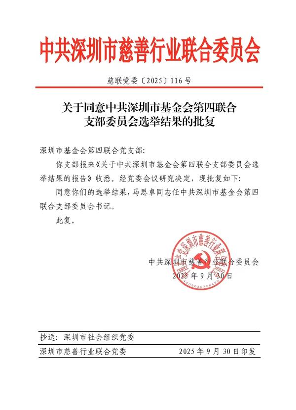 2025年9月15日,深圳市基金会第四联合党支部成立大会召开,经由中共深圳市慈善行业联合委员会批复,马思卓同志任选中共深圳市基金会第四联合支部委员会书记。