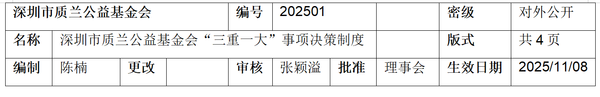为进一步规范深圳市质兰公益基金会(以下简称"本基金会") 的重大决策行为,提高决策水平、防范决策风险,推进民主集中制,促进民主、科学和规范决策,根据有关规定和要求,结合本基金会实际,特制定本基金会重大事项决策、重要人事任免、重大项目安排和大额资金运作(以下简称"三重一大") 事项决策制度。